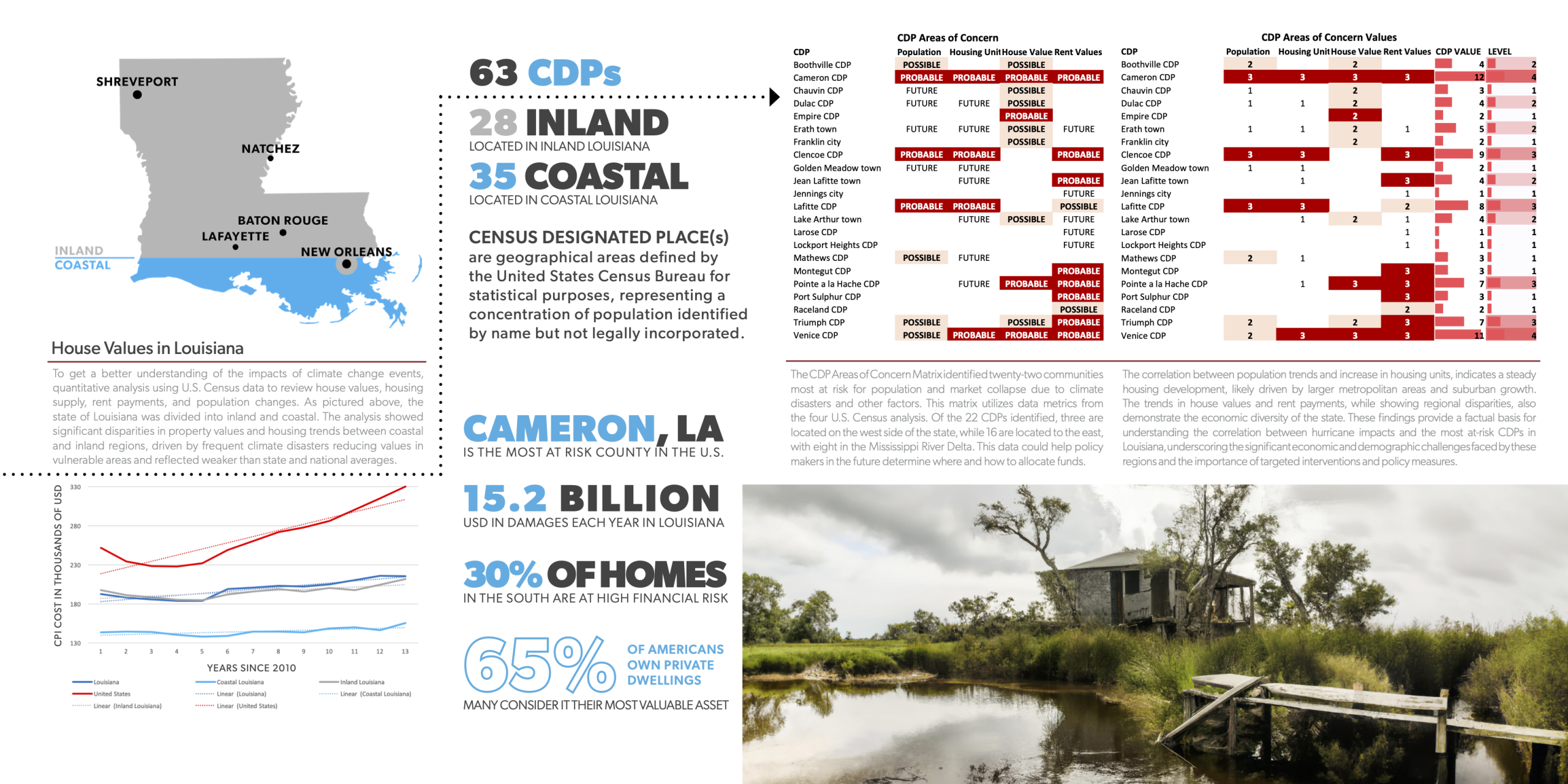 From my research, it shows that climate refugees often struggle to enter safer housing markets due to limited economic mobility, with record rent and home price increases in safer regions and stagnant values in those they leave behind (USCB, 2010–2022). In Louisiana, the gap between local and national housing costs can trap residents in place, a challenge made more pressing given that over 65% of Americans own homes they consider their most valuable asset (Hill, 2023).