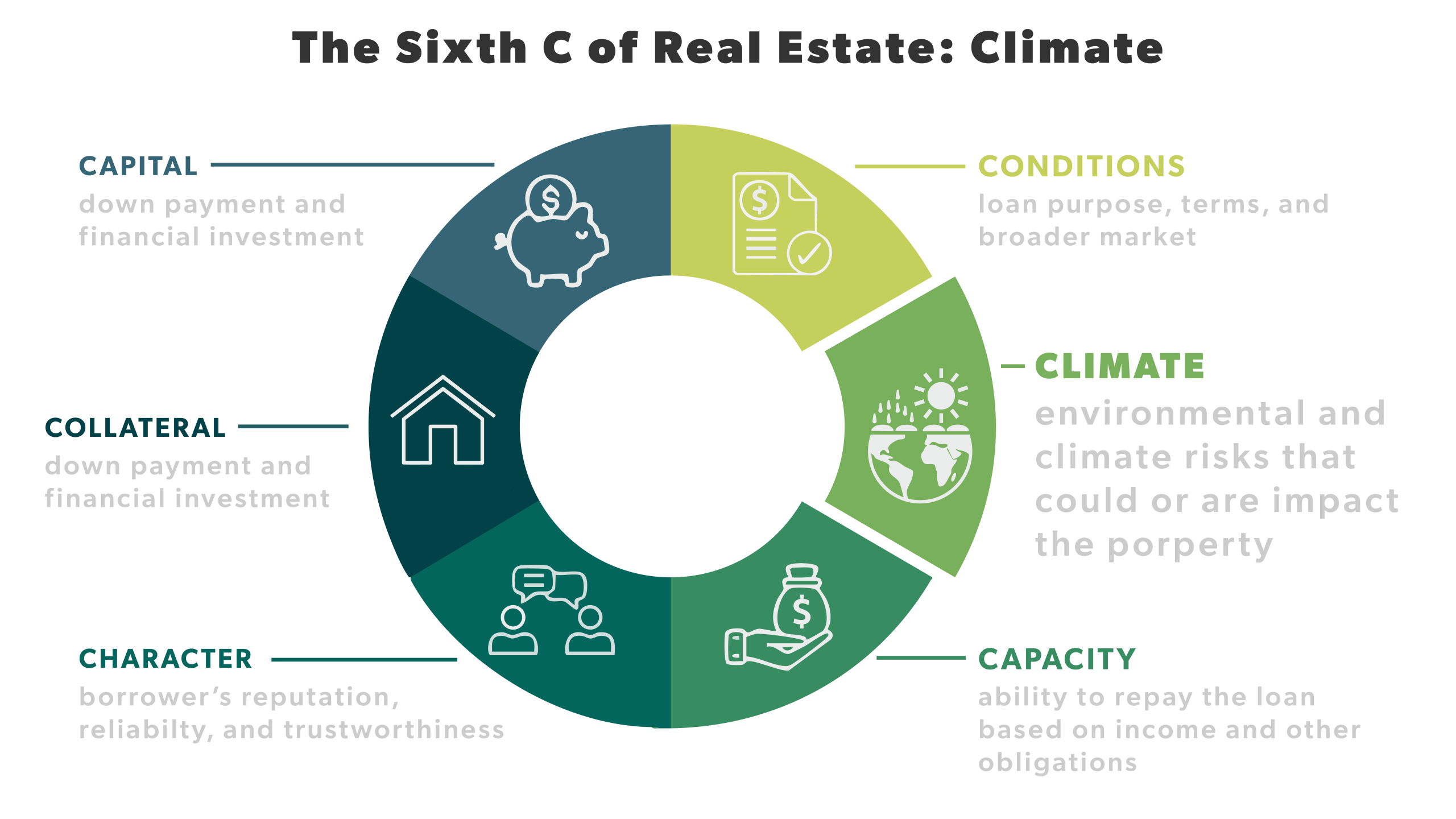 Traditionellt har banker tittat på fem “C:n” vid kreditprövning vilket såklart blir särskilt roligt vid en översättning till Karaktär, Kapacitet, Kapital, Säkerhet och Villkor. Nu menar klimatforskare att det är dags att lägga till ett sjätte: Climate.